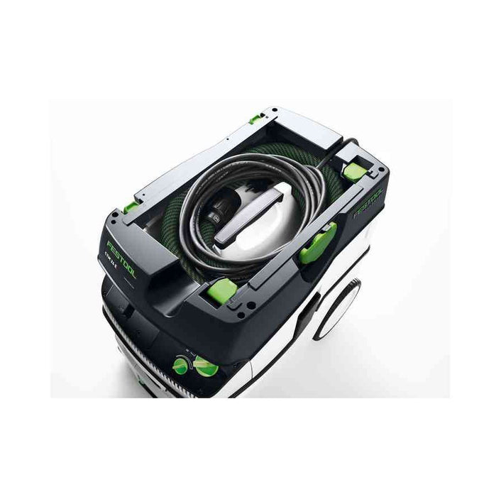 Tout est en ordre. Le câble d'alimentation et le tuyau d'aspiration sont rangés comme il faut, bien protégés dans le logement pour tuyau Festool intégré et l'enroulement de câble. |