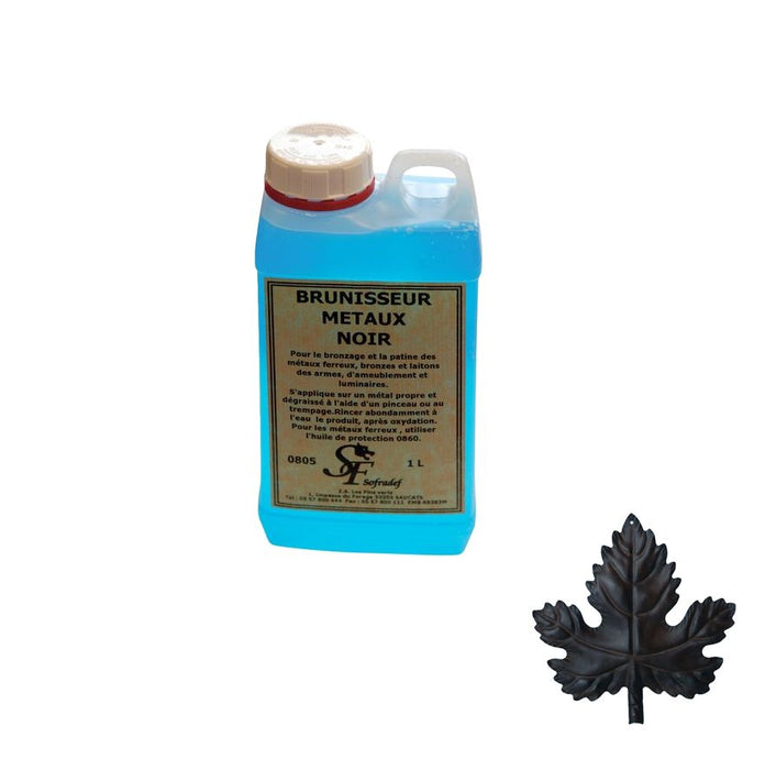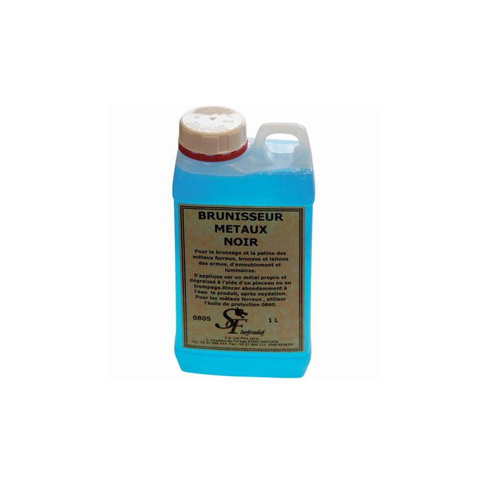 Bidon d'un litre de brunisseur pour métaux noir foncé.