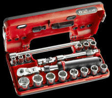 14 x douilles 3/8" 6 pans métriques : J.8H - 9 - 10 - 11 - 12 - 13 - 14 - 15 - 16 - 17 - 18 - 19 - 21 - 22 mm.