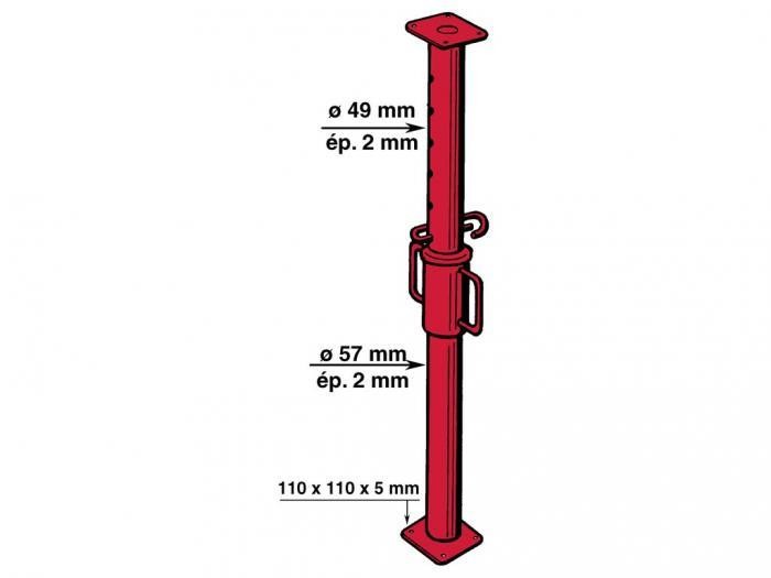 Manchon de réglage en acier soudé, Coulisse : Ø 49 x 1,8 mm, Fût tubulaire acier Ø 57 mm x ép. 1,8 mm, Clavette imperdable Ø 12 mm, Hauteur : 1,60 à 2,90 m, Platines : 110 x 110 x 4 mm,