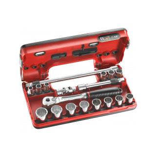 - 14 x douilles 3/8" 12 pans métriques : J. 8 - 9 - 10 - 11 - 12 - 13 - 14 - 15 - 16 - 17 - 18 - 19 - 21 - 22mm.