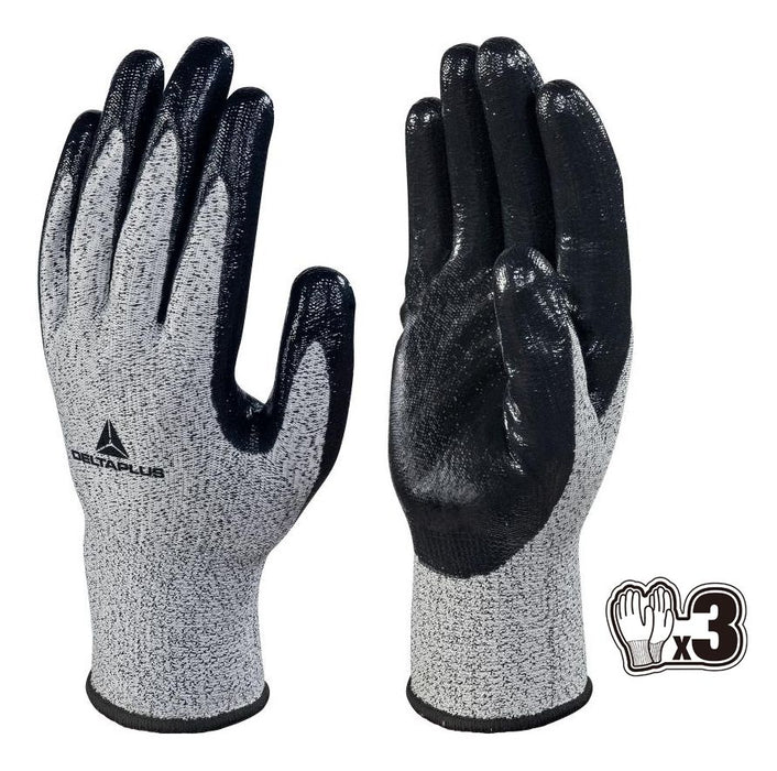 Fibre haute performance ECONOCUT®. Enduction nitrile sur paume et bout des doigts. Jauge 13. Sachet de 3 paires.