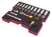 Cliquet 3/8 + Rallonge 75mm et 150 mm + Cadran universel 3/8 + Jeu de clés mâles 14 pièces + 10 Douilles 6 pans de 10 à 19mm + 10 Douilles longues 6 pans de 10 à 19mm