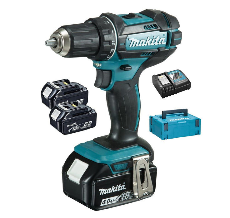 Perceuse livré en coffret 2 MAKPAC avec 3 batteries Li-Ion 18V 4Ah, un chargeur rapide et un crochet ceinture.