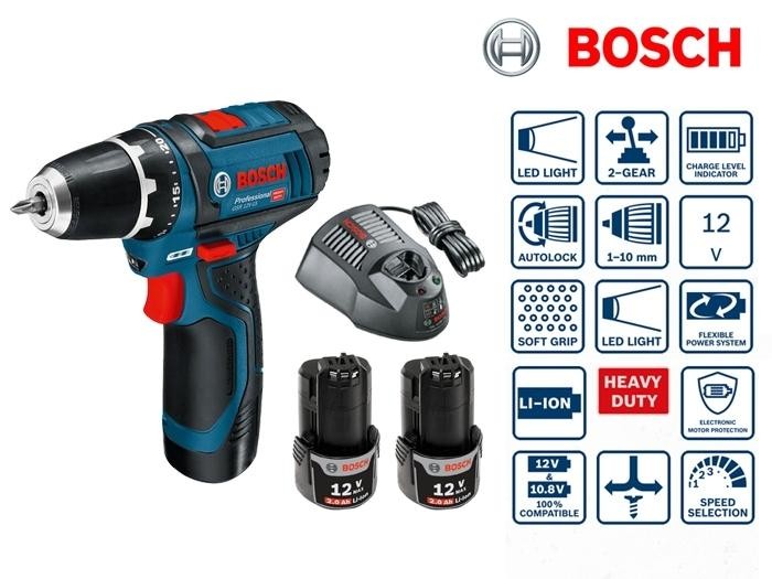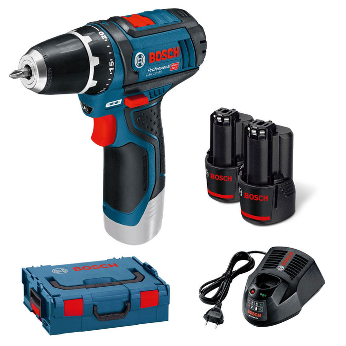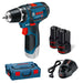 Perceuse-visseuse à batterie 12V Li-Ion 2 Ah GSR 12V-15 Bosch livrée avec deux batteries GBA 12V 2,0 Ah et un chargeur rapide GAL 1230CV.