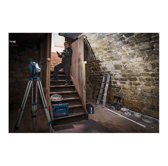 Il est protégé contre les poussières et les projections d’eau (IP 64) et dispose d’un couvre-batterie robuste. La luminosité du projecteur peut être réglée rapidement et facilement à distance à partir d’un smartphone. Ses deux niveaux de luminosité, son orientation possible dans cinq différentes positions et son filetage de trépied 5/8" permettent une adaptation rapide à chaque situation de travail. Ce projecteur est idéal pour éclairer des espaces de travail complets pendant toute une journée. L’outil est compatible avec toutes les batteries 18 V* de Bosch Professional (Professional 18V System). * Le couvre-batterie ne se ferme pas complètement en cas d’utilisation d’une batterie ProCORE18V 12.0Ah