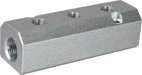 Rampe multi sorties gros débit - Bloc en aluminium anodisé couleur Argent - 2 entrées 1/2" F - 3 sorties 1/2" F - 2 trous Ø 6 mm pour fixation