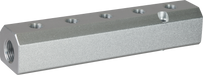 Rampe multi sorties gros débit - Bloc en aluminium anodisé couleur Argent - 2 entrées 1/2" F - 5 sorties 1/2" F - 2 trous Ø 6 mm pour fixation