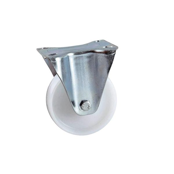 Roulette fixe à platine rectangulaire, roue polyamide blanc diamètre 125 mm, charge 150 Kg.