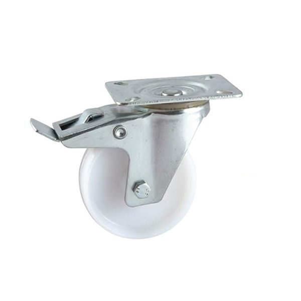 Roulette pivotante à frein à platine rectangulaire, roue polyamide blanc diamètre 125 mm, charge 150 Kg.